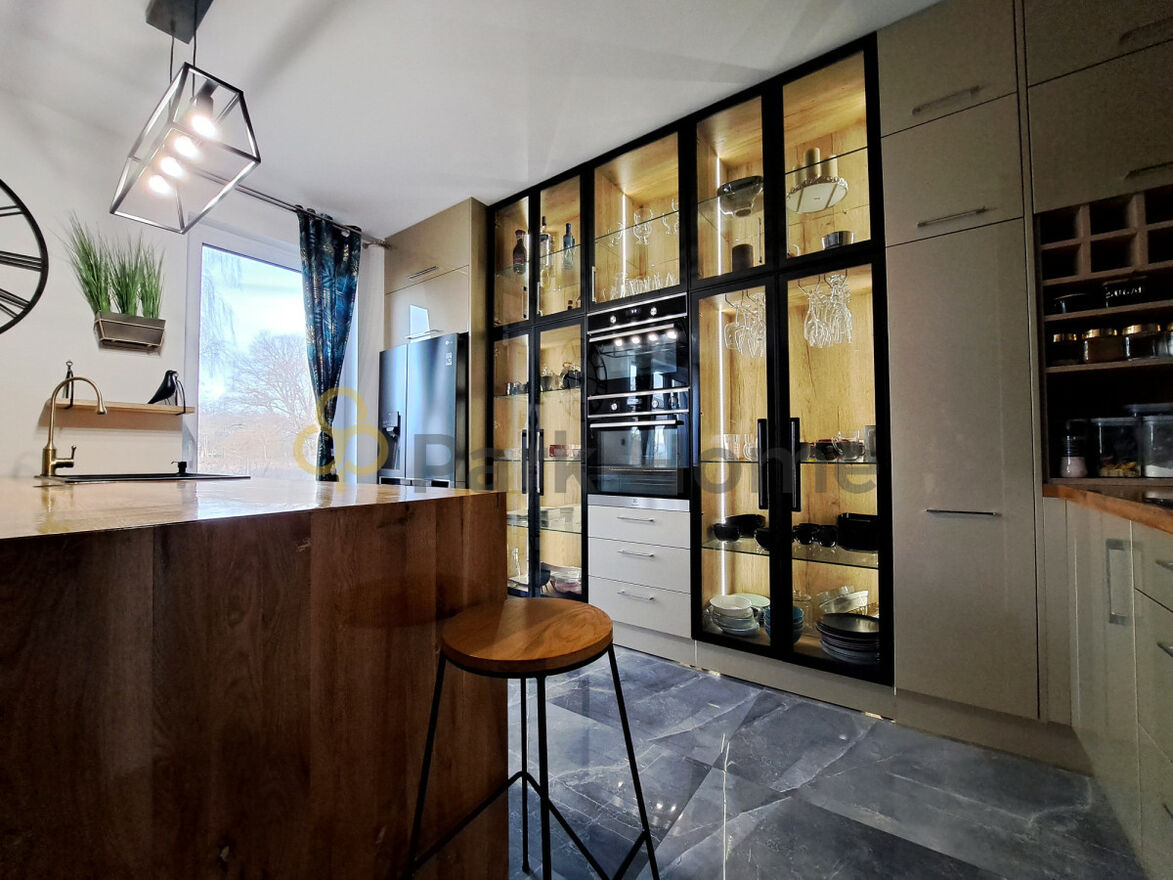 W kuchni- meble na wymiar, pod zabudowę, w nowoczesnej kolorystyce. Sprzęt AGD w zabudowie: piekarnik, zmywarka, płyta indukcyjna i okap.